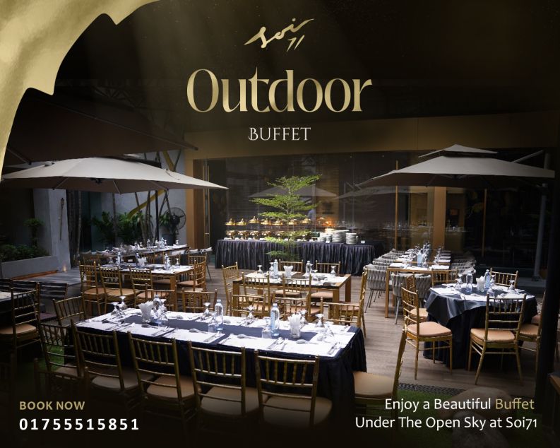 Dine under the open sky with elegance and flavor 🌌🍽️ Enjoy a serene outdoor buffet experience with delicious cuisine, cozy ambiance, and unforgettable moments at Soi 71. Perfect for nights to remember! ✨
